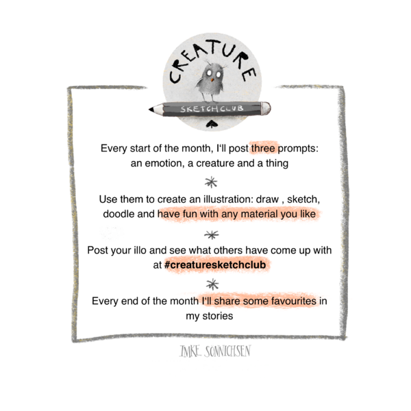 Als ich mein Fauna Projekt abgeschlossen hatte, wollte ich weiter Tiere und Kreaturen zeichnen und mein Publikum miteinbeziehen. Also überlegte ich ein Spiel, in dem mehrere Begriffe zu einer Illustration kombiniert werden sollten. Diese Begriffe veröffentlichte ich immer am Anfang der Woche und mein Ergebnis jeden Sonntag. Die Ergebnisse der anderen Teilnehmenden zeigte ich in meinen Instagram Stories.