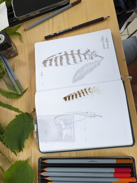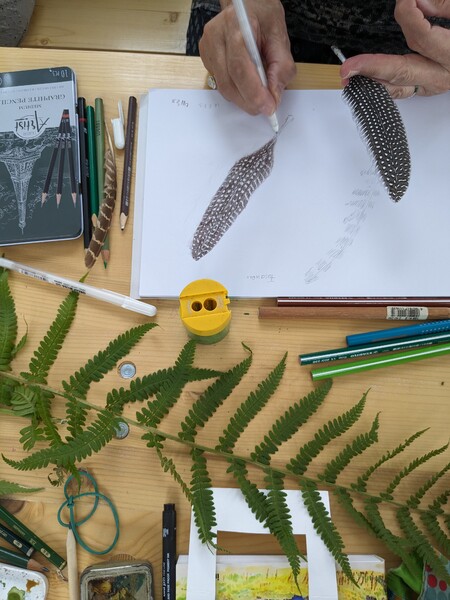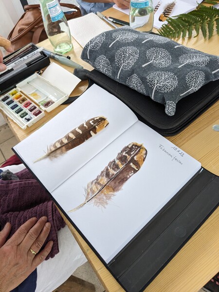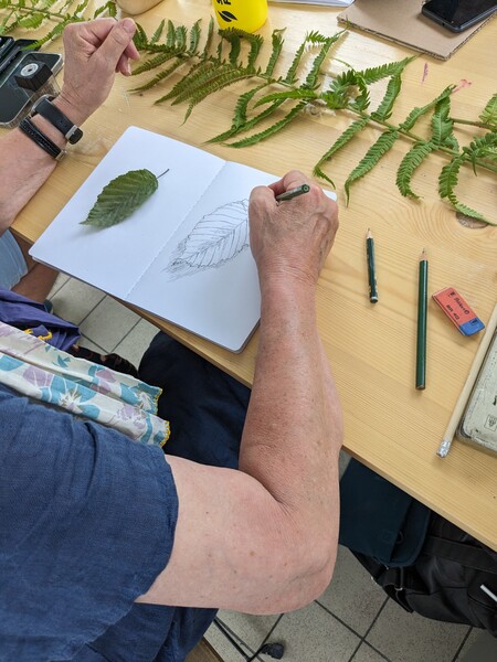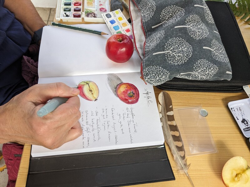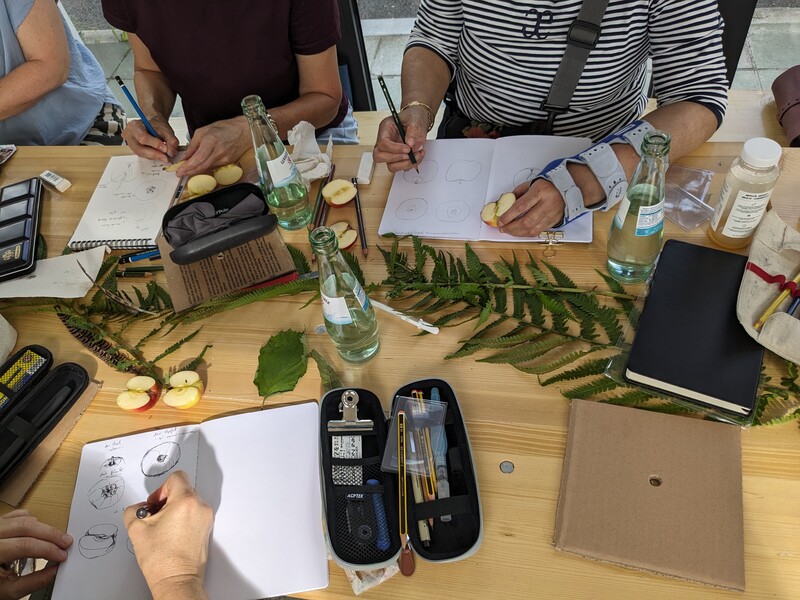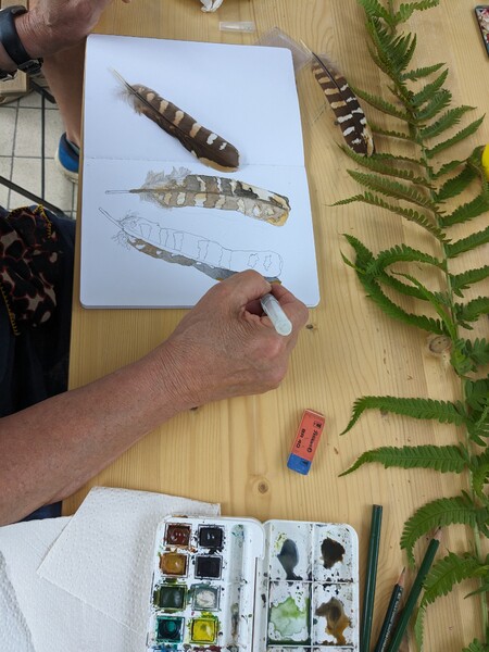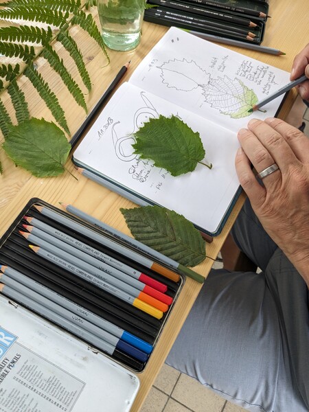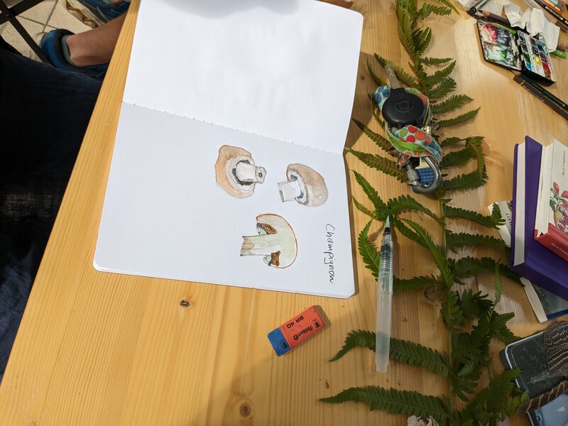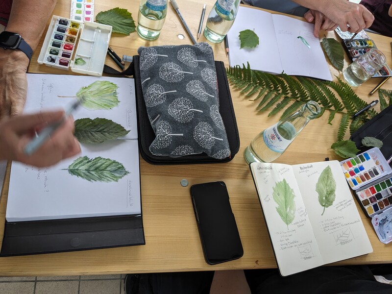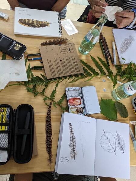 Außerdem konnte ich im Sommer 2023 einen Workshop zum Thema "Nature Journaling" im Belgisches Grenzhaus am Kukuk anbieten. Es gab mehrere einleitende Aufgaben, und da das Wetter gut war, konnten wir auch aufbrechen in den Wald und zu den Panzersperren in der Nähe. Letzteres ist ein lohnendes Motiv, da dort die Natur ein Refugium gefunden hat zwischen Überresten aus dem Krieg.